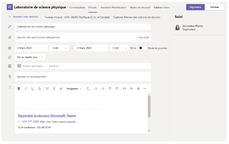 Sélectionnez Conférence maintenant pour démarrer la réunion immédiatement, ou Planifier une réunion pour planifier la réunion à l’avenir. Si vous décidez de planifier une réunion, les membres du canal voient une invitation dans leur calendrier.