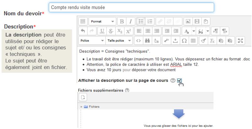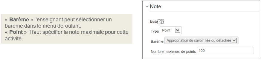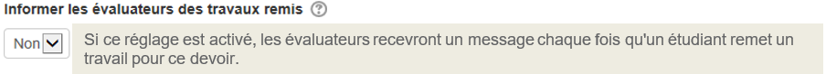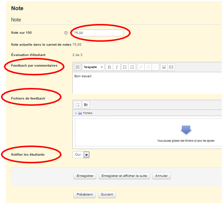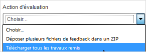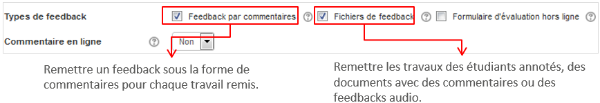 Lors de l' évaluation des devoirs , les enseignants peuvent donner aux étudiants des feedbacks , leur envoyer des fichiers : travaux annotés, documents avec commentaires ou feedbacks audio. Les devoirs peuvent être évalués au moyen d'une note numérique , d'un barème spécifique ou d'une méthode avancée comme une grille d'évaluation .