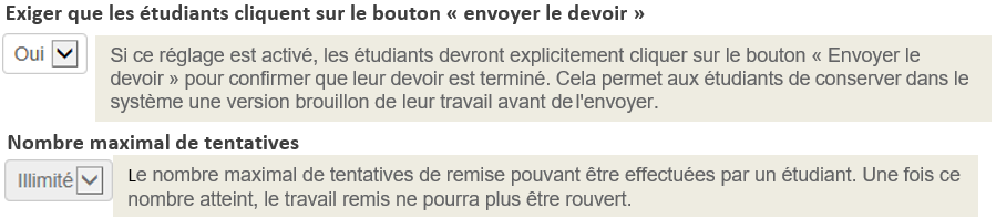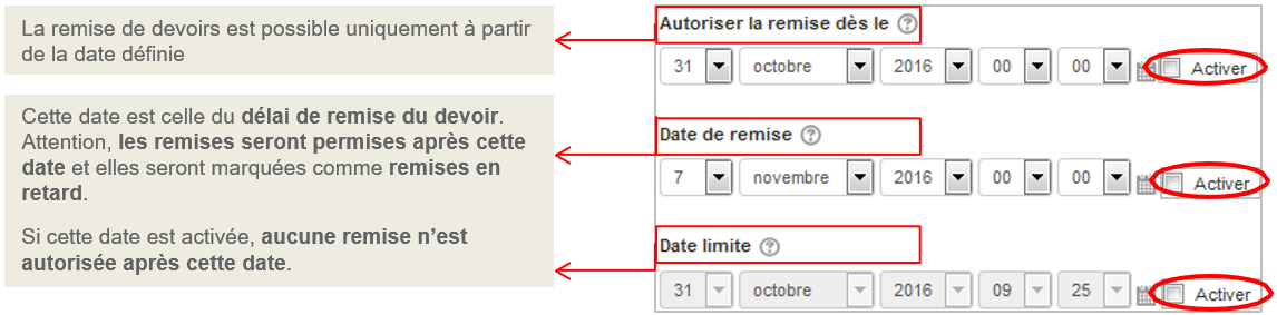 Paramétrer une date d'ouverture et une de fermeture de l'espace devoir, en fonction desquelles l'étudiant est autorisé à remettre son devoir.