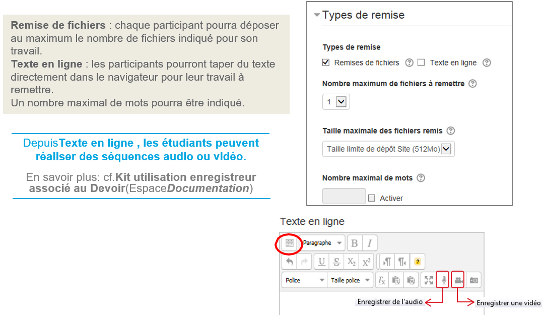L'activité " Devoir " permet à un enseignant de communiquer aux participants des tâches, de récolter des travaux et de leur fournir feedbacks et notes .