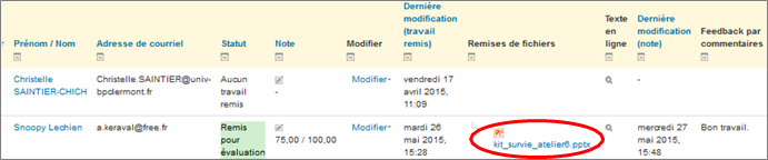 Cliquer sur le nom du devoir . Un tableau « résumé de l’évaluation » vous permet de prendre connaissance du nombre de participants, nombre de travaux remis…