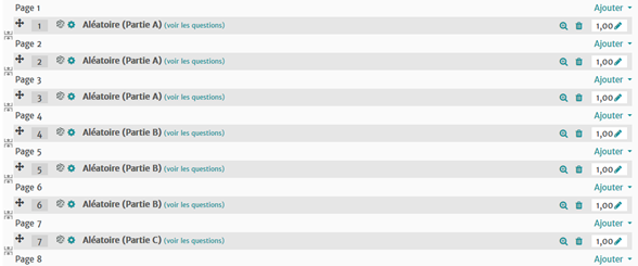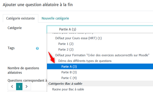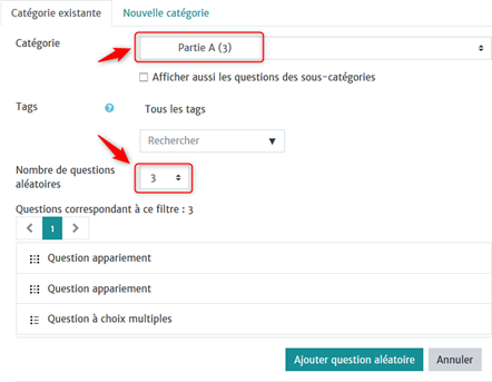 Supposons que votre test soit composé de 3 parties bien distinctes. L’idée serait de constituer trois catégories de questions qui correspondent aux trois parties du test et de mettre en place un système de tirage aléatoire des questions à l’intérieur de chaque catégorie.