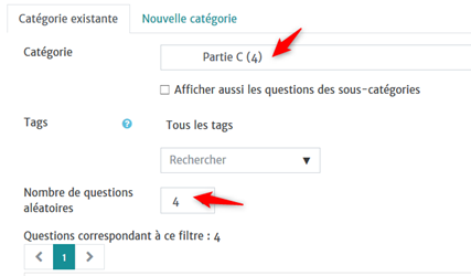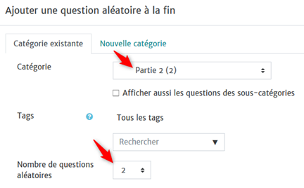 Étape 1 : Créer deux catégories du test et alimenter chaque catégorie avec un certain nombre de questions : cf. Voir le tutoriel « Créer des tests dans Moodle » points 1-2 pour créer une catégorie et ajouter des questions dans une catégorie ;