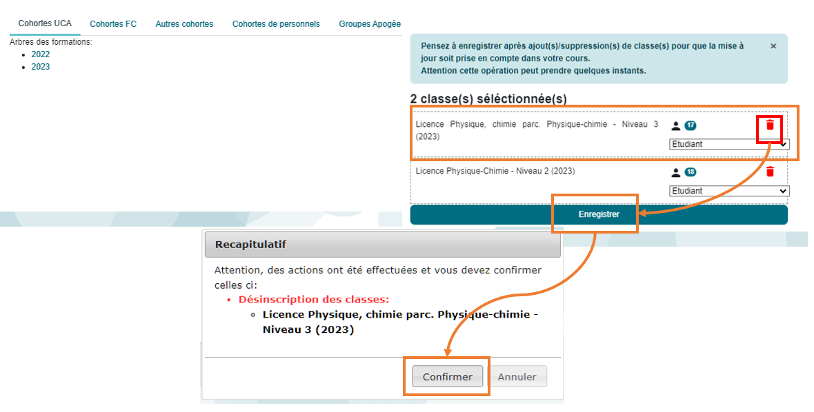 Vous pouvez désinscrire tout type de classe inscrite à votre cours ( classes de la Formation Initiale, de la Formation Continue ou des cohortes des personnels) .