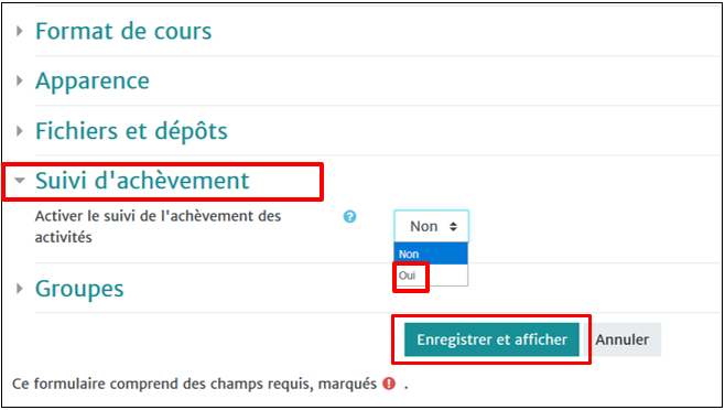 Étape 4 : A la fin du formulaire qui récapitule les paramètres de votre cours cliquer sur " Suivi d’achèvement "
