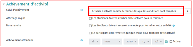 Étape 3 : Sélectionner " Afficher l’activité comme terminée dès que les conditions seront remplies "